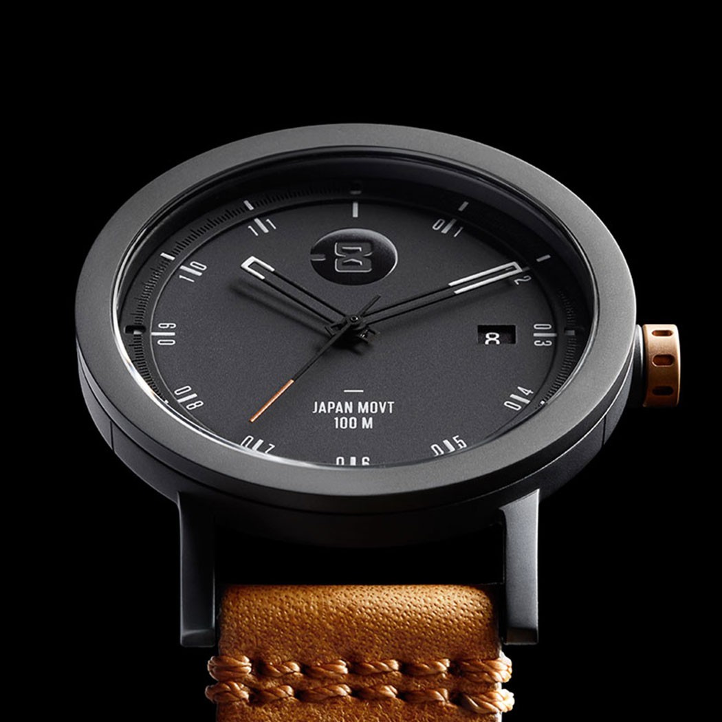 First up is the Minus-8 watch in stylish black, offset with a touch of copper and a tan leather band. These colors have always gone well together.