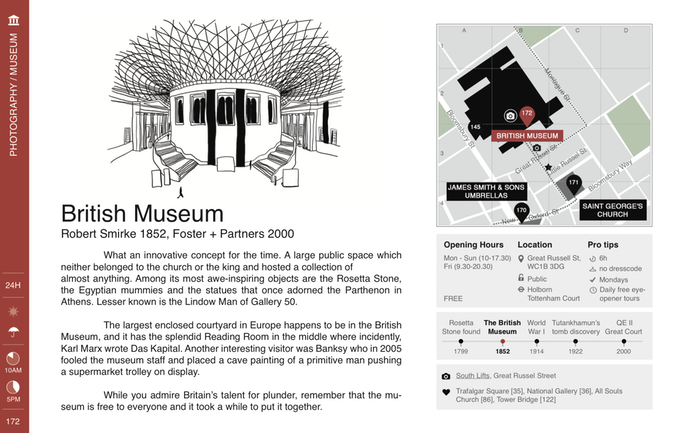 Each location has its own page, with a sketch (no photographs to spoil your upcoming visit), story, recommendations, a map, recommended itineraries, information such as opening times and suggested itinerary. There are other useful tips such as how long it will take you to visit the place, how to pay and how to get the cheapest tickets. There is also a useful timeline to put the place in context.