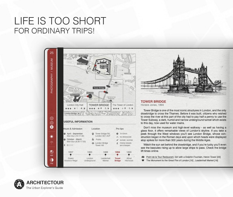 Architectour guides are beautifully designed hardcover travel guides that are very practical. As well as the usual sights, they also feature the not-so-obvious places.