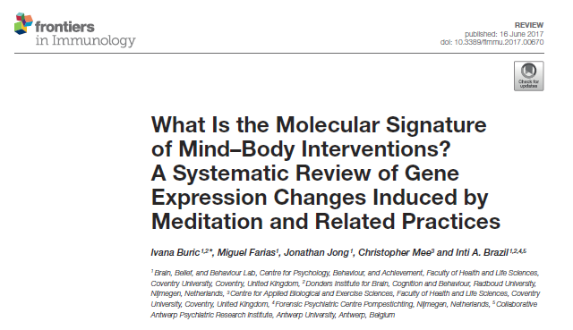 Now evidence suggests that there is an actual physical change in gene expression of harmful chemicals. There is down-regulation of the gene for a chemical called nuclear factor kappa B, a molecule that is released in response to stress. This leads to increased production of cytokines, which cause inflammation. If there is chronic increase in this chemical, there is increased aging, depression and risk of cancer. This study suggests that meditation practices may lead to a reduced risk of inflammation-related diseases. Another good reason to meditate.