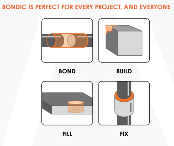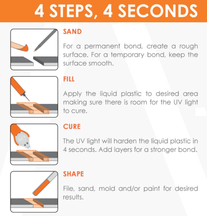 First unveiled in 2014, Bondic is a solvent-free liquid plastic that sets under ultraviolet light. Unlike traditional glues and epoxy resins, it does not stick to fingers and can be worked without rushing as it will not set on contact with air alone. This also avoids the frustration of opening a tube of glue for a small job and seeing the rest harden in the tube shortly afterwards.