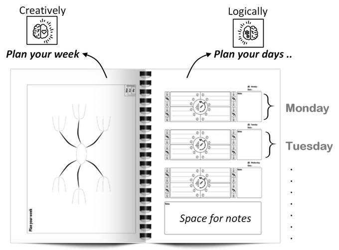 For goal setting, instead of long lists of goals broken down into smaller goals, it uses mind maps to help give a visually appealing view of your week and goals.