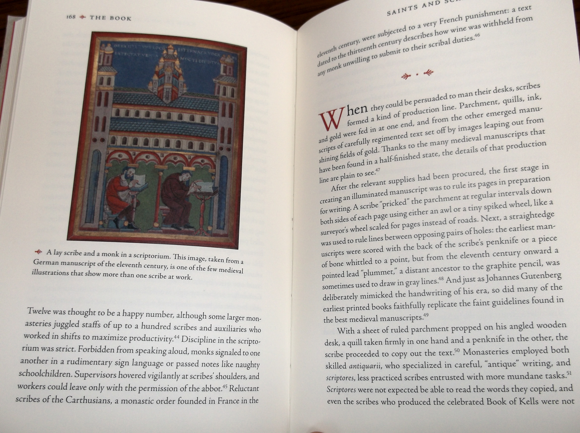 The great monastic books were first created in Ireland and spread to Britain. The Viking raids on the Irish coast sent refugees from the monasteries to the Continent, and with them the art of illustration and illumination. We admire the beauty of these books, but the scribes toiled in poor, factory-like conditions. Keith Houston describes the inks and their compositions - many ingredients were brought to Europe from afar. He discusses the working conditions, which were hard and cold.