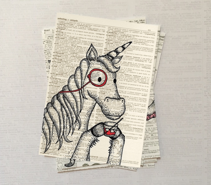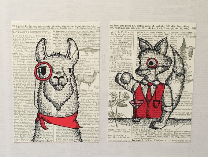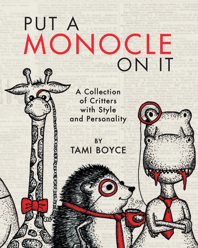 Tami Boyce draws adorable animals and then puts a monocle on them, and they become adorable and intelligent. Drawing them on a background dictionary page with the animal's entry makes them appear even more intelligent and stylish.