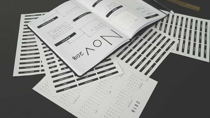 The planner consists of a high quality notebook, which comes in either black dot-grid format or in "nude" design paper, and a set of stickers for dates and headings. There is a pocket in the back of the notebook to store the stickers.
