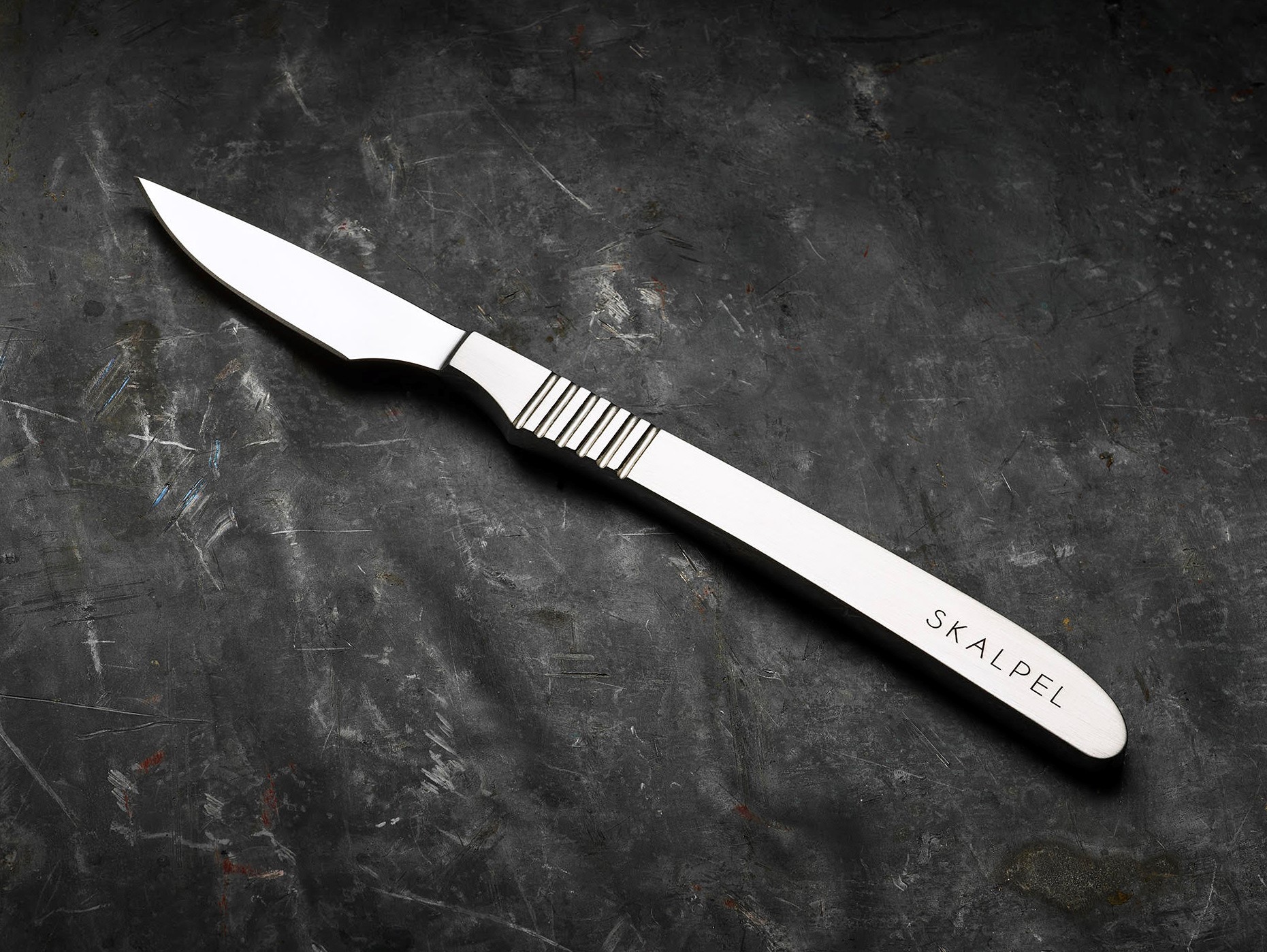 Knife maker Stuart Mitchell from Sheffield, England took inspiration from the surgeon's scalpel to create this precision knife. It is made from a solid piece of stainless steel. The grooves on the handle are for better grip. This is surely going to be a conversation piece when you pull it out at dinner time.