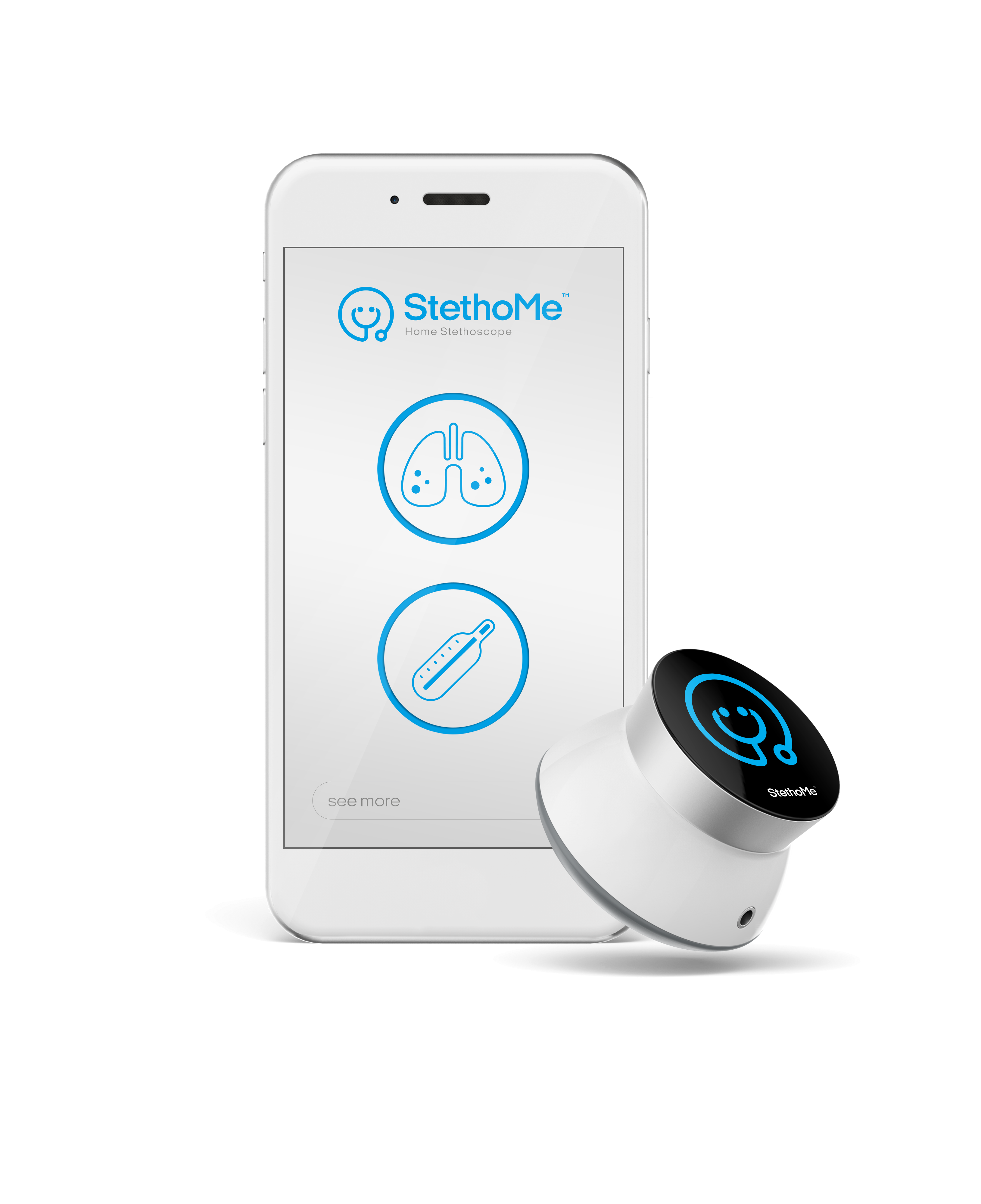 The StethoMe is a new all-in-one unit that records heartbeat, lung sounds and temperature. Unlike the Clinicloud, the readings are displayed on a screen on the back of the unit. It can wirelessly transmit the readings to a cell phone for storage in a record which can be forwarded to your family doctor for consultation.